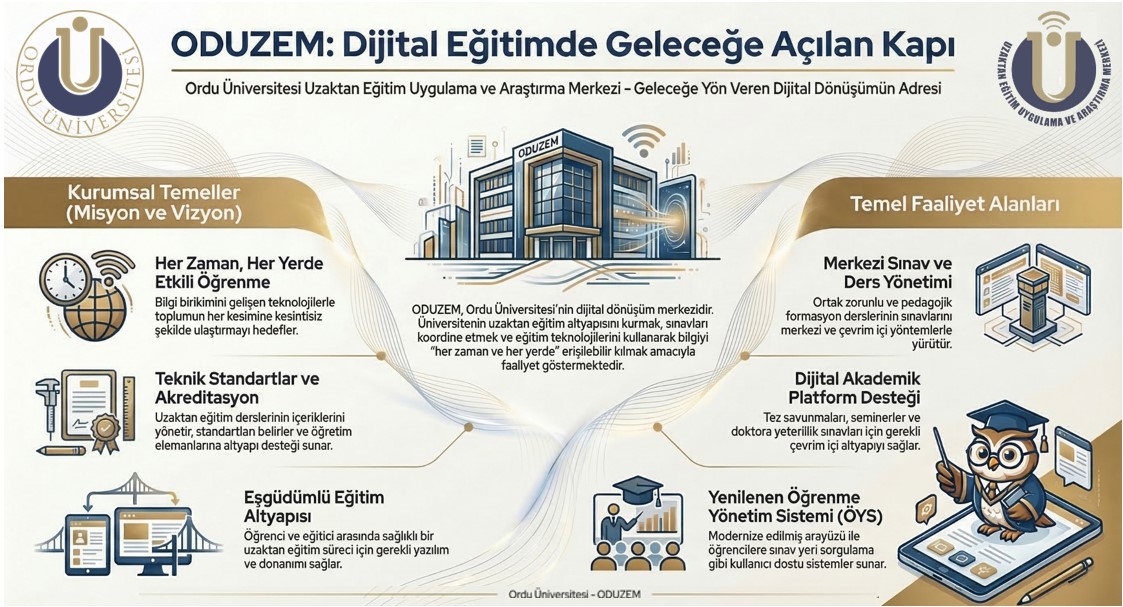 Ordu Üniversitesi Uzaktan Eğitim Uygulama ve Araştırma Merkezi (ODÜZEM), üniversitemizin dijital eğitim altyapısını güçlendirme, uzaktan eğitim süreçlerini kurumsal bir yapı içerisinde yürütme ve akademik faaliyetlere teknolojik destek sağlama yönündeki çalışmalarını kararlılıkla sürdürmektedir. Merkezin temel yaklaşımı; uzaktan eğitim alanında gerekli teknik standartları belirlemek, donanım, yazılım ve personel altyapısını oluşturmak, bu altyapının sürekliliğini sağlamak ve eğitim süreçlerinin öğrenci ile eğitici açısından eşgüdüm içerisinde sağlıklı bir şekilde yürütülmesini temin etmektir.