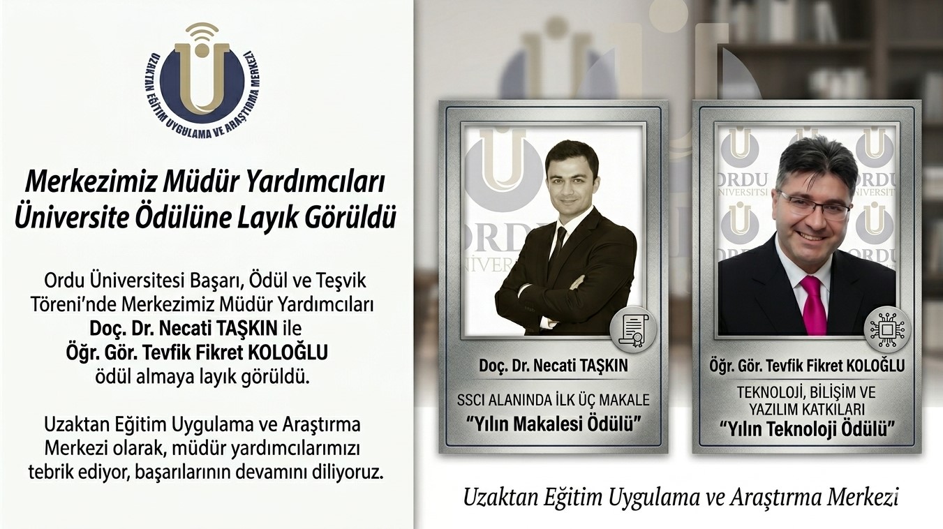 Ordu Üniversitesi tarafından düzenlenen Başarı, Ödül ve Teşvik Töreni’nde, Uzaktan Eğitim Uygulama ve Araştırma Merkezi Müdür Yardımcılarımız Doç. Dr. Necati Taşkın ile Öğr. Gör. Tevfik Fikret KOLOĞLU, çalışmalarıyla ödüle layık görüldü.